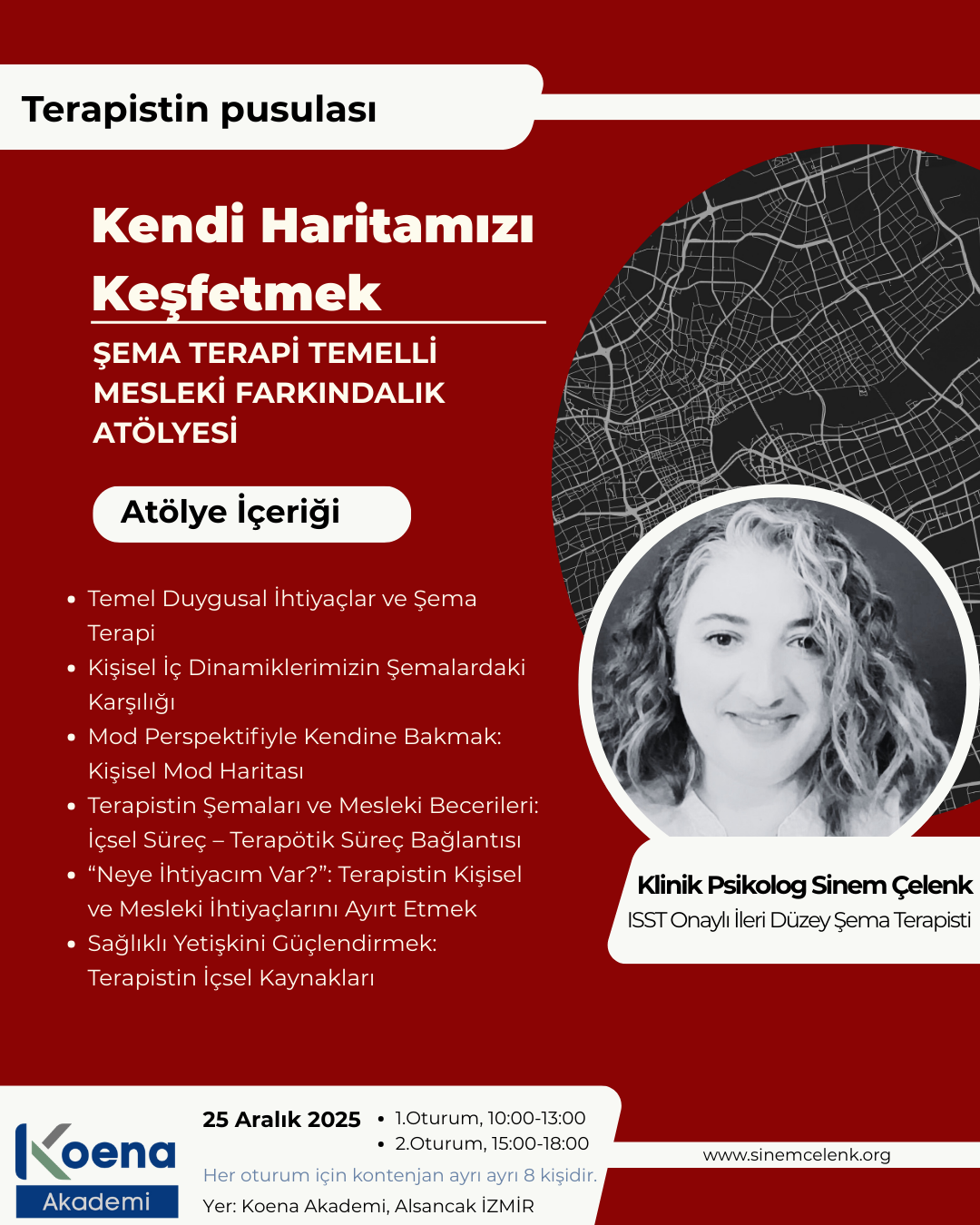 Terapistin Pusulası Kendi Haritamızı Keşfetmek Şema Terapi Temelli Mesleki Farkındalık Atölyesi Yüz Yüze – Alsancak | 25 Aralık 2025 | Süre: 3 saat | Kontenjan: 8 kişi Yılın sonuna yaklaşırken, danışanlarımızın ihtiyaçlarını duyarken kendi iç dengemizi ne kadar koruyabildiğimiz, bazen ikinci plana düşebiliyor. Bu atölye, tam da bu noktada; şema terapi perspektifiyle kendimize kulak verebileceğimiz, […]